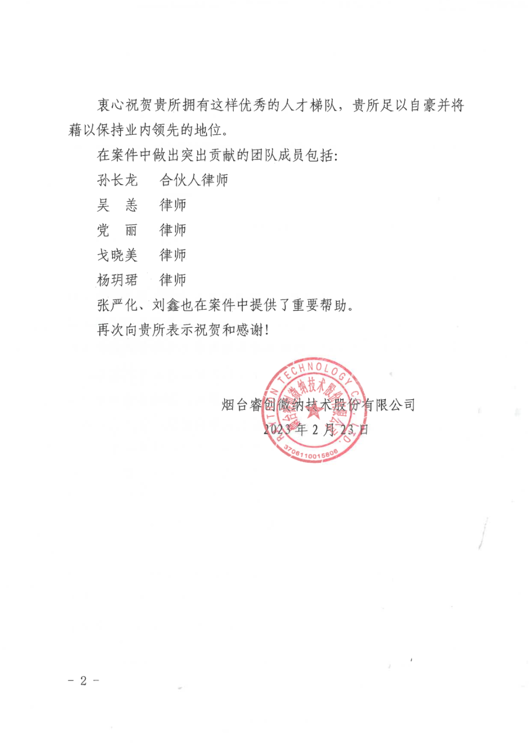 图1 睿创集团向NG28寄送的表扬信