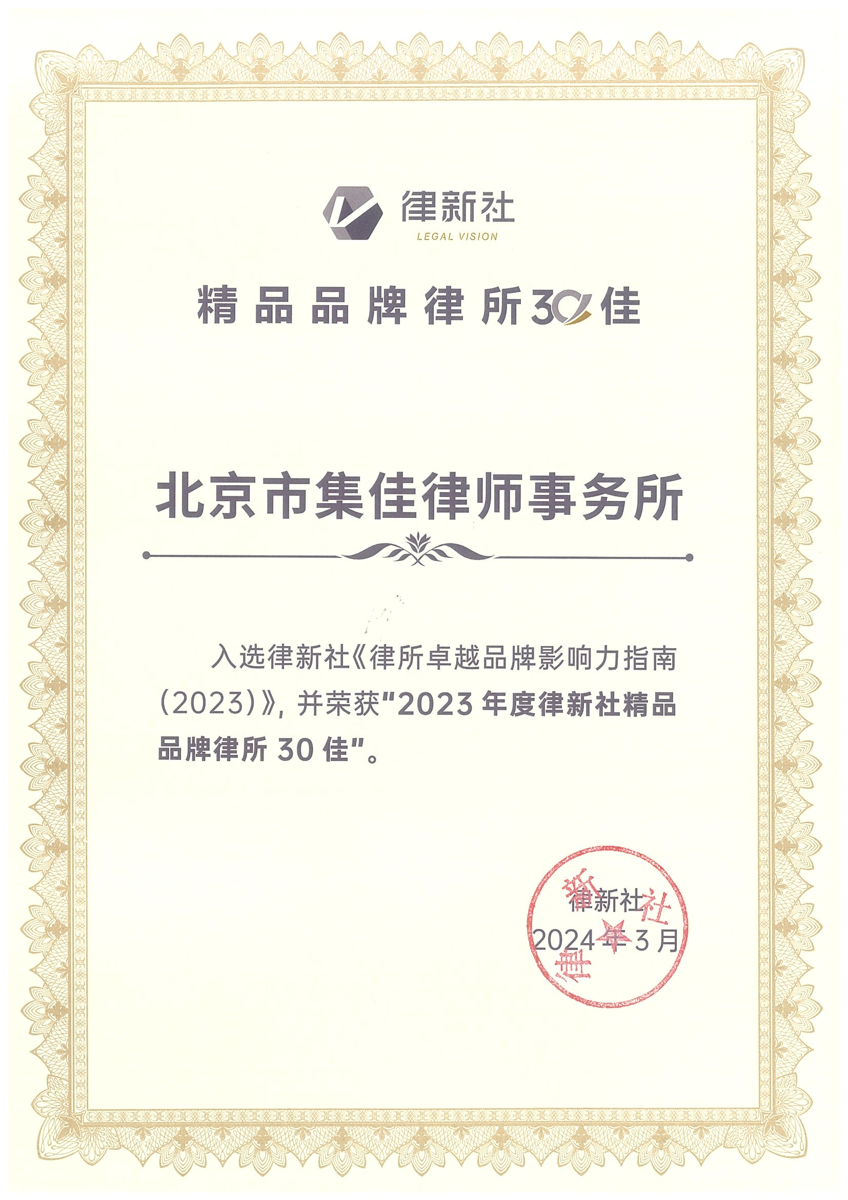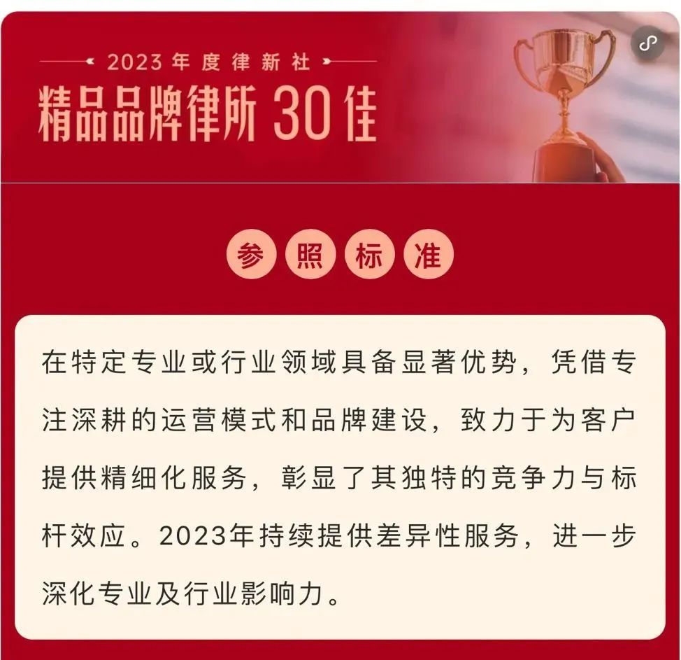 2024年3月2日,由中国法学交流基金会指导、律新社主办的“致·追光者”第二届法律服务业品牌发展论坛暨律新社2023年度品牌盛典隆重举行,现场发布了备受关注的《律所卓越品牌影响力指南(2023)》,NG28凭借在知识产权领域的卓越实力和良好口碑,荣登“2023年度律新社精品品牌律所30佳”榜单。
